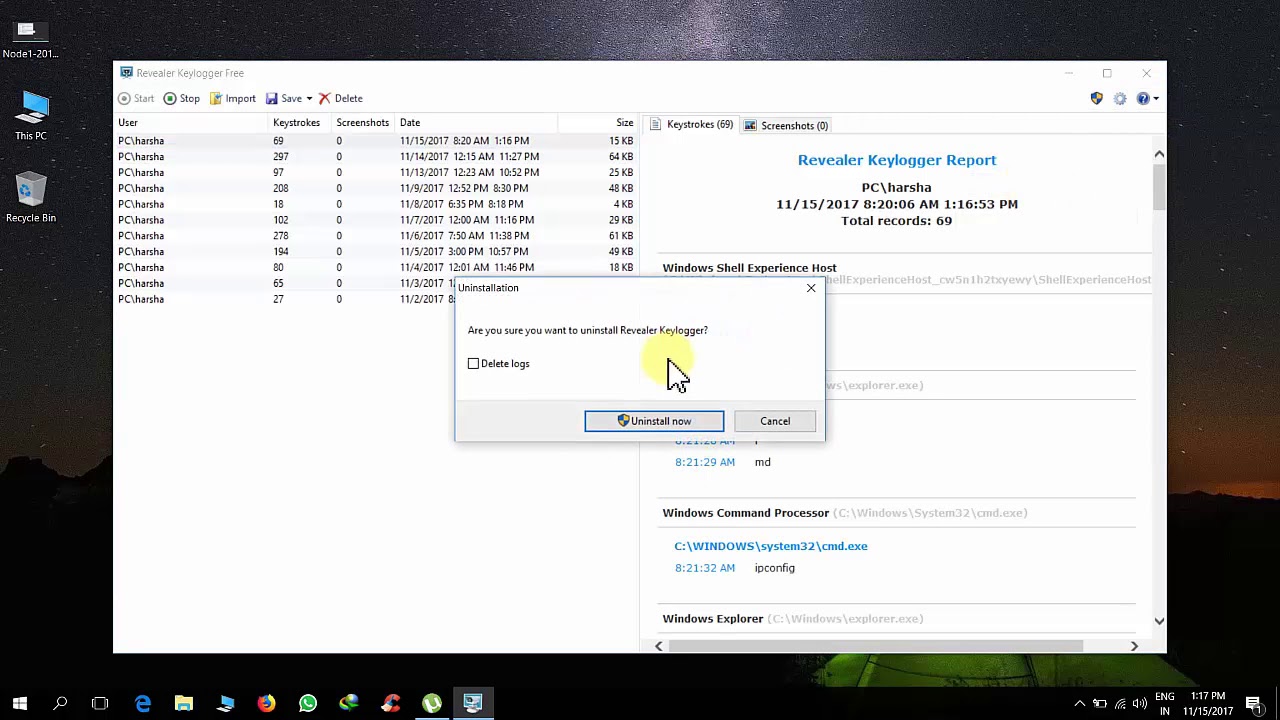 After completing the test, uninstall the keylogger from the virtual environment and restore the VM to its original state by deleting the current session or resetting the machine. This ensures that no harmful software remains on your system.