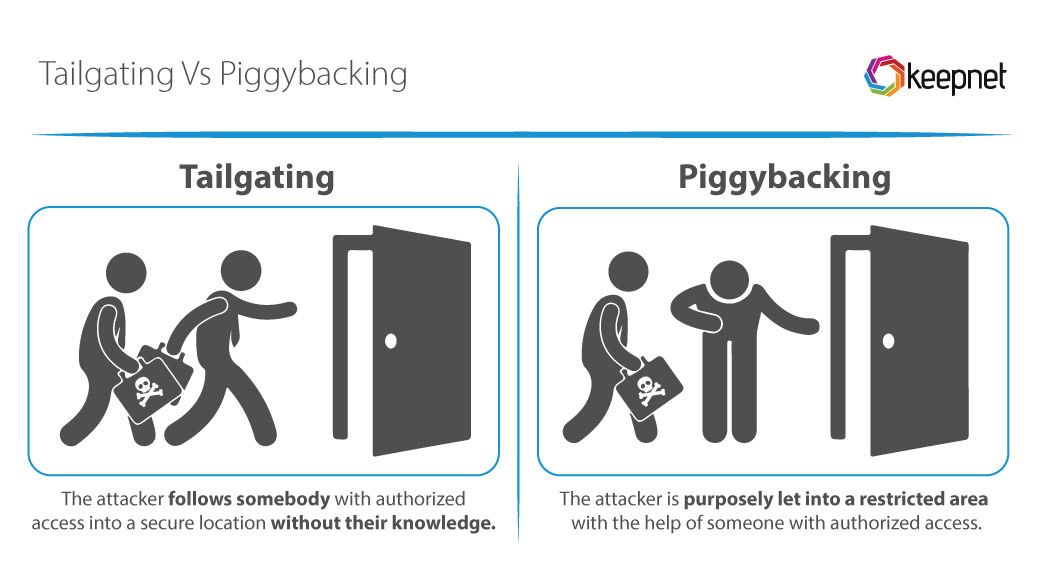 For example, an attacker might wait outside a corporate building until an employee enters. They then follow the employee closely, passing through the door without using a keycard.